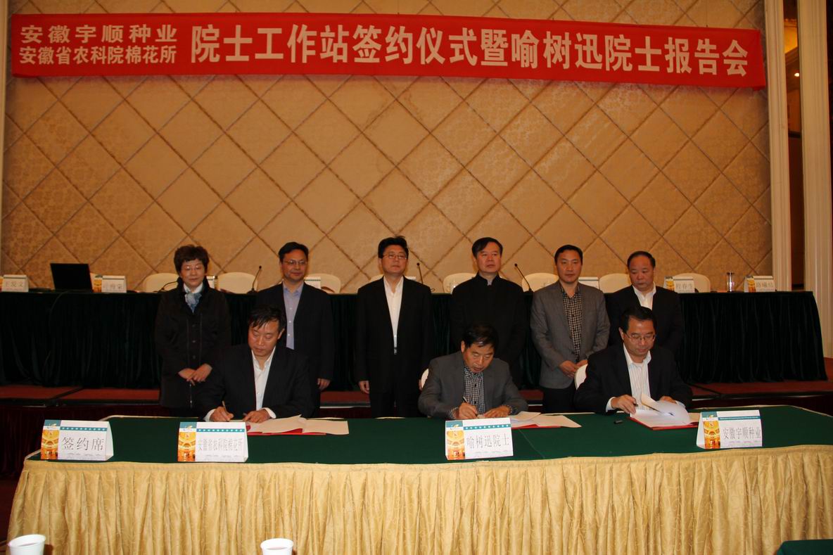 2014年4月13日上午,由中國(guó)工程院喻樹(shù)迅院士與安徽宇順?lè)N業(yè)開(kāi)發(fā)有限公司、安徽省農(nóng)科院棉花所共建成立的“棉花院士工作站”簽約儀式在安慶碧桂園鳳凰酒店舉行,標(biāo)志著全市首家農(nóng)業(yè)院士工作站簽約成立。中國(guó)農(nóng)科院棉花所研究員、中國(guó)工程院院士喻樹(shù)迅,安徽省農(nóng)科院院長(zhǎng)楊劍波以及省農(nóng)業(yè)機(jī)械推廣總站、省農(nóng)科院棉花所、國(guó)家棉花長(zhǎng)江試驗(yàn)站等部門(mén)的領(lǐng)導(dǎo)專(zhuān)家出席簽約儀式。市農(nóng)委、市科技局、市財(cái)政局,有關(guān)縣區(qū)農(nóng)委(農(nóng)業(yè)局)負(fù)責(zé)人和相關(guān)技術(shù)人員參加簽約儀式。簽約儀式由市政府副秘書(shū)長(zhǎng)張仕慶主持。市政府副市長(zhǎng)張小青在儀式上指出,安慶農(nóng)業(yè)基礎(chǔ)較好,是國(guó)家農(nóng)業(yè)部確定的棉花優(yōu)質(zhì)生產(chǎn)區(qū)域,現(xiàn)已發(fā)展為全國(guó)棉花紡織精品生產(chǎn)基地,我市的望江縣和宿松縣是全國(guó)著名的棉花百?gòu)?qiáng)縣。他強(qiáng)調(diào),院士工作站的成立契合我市農(nóng)業(yè)領(lǐng)域正在實(shí)施的“5211”工程,必將進(jìn)一步提升我市棉花生產(chǎn)儲(chǔ)運(yùn)能力和科技科研水平,為實(shí)現(xiàn)我市乃至我省棉花生產(chǎn)方式的根本變革提供技術(shù)支撐,也必將推進(jìn)我市農(nóng)業(yè)產(chǎn)業(yè)化整體水平。