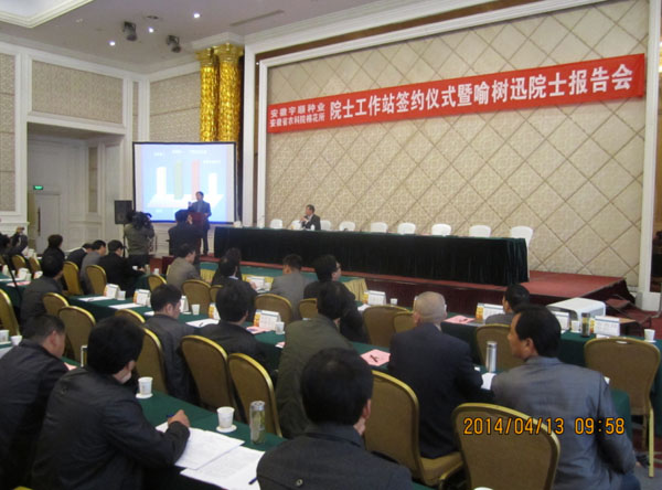 2014年4月13日,安慶市首家農(nóng)業(yè)院士工作站在安慶碧桂園鳳凰酒店正式簽約成立,簽約儀式結(jié)束后,喻樹迅院士做了題為“快樂植棉與生態(tài)保護(hù)”的專題報告,報告會由安徽省農(nóng)科院棉花研究所路曦結(jié)所長主持。