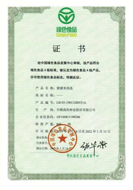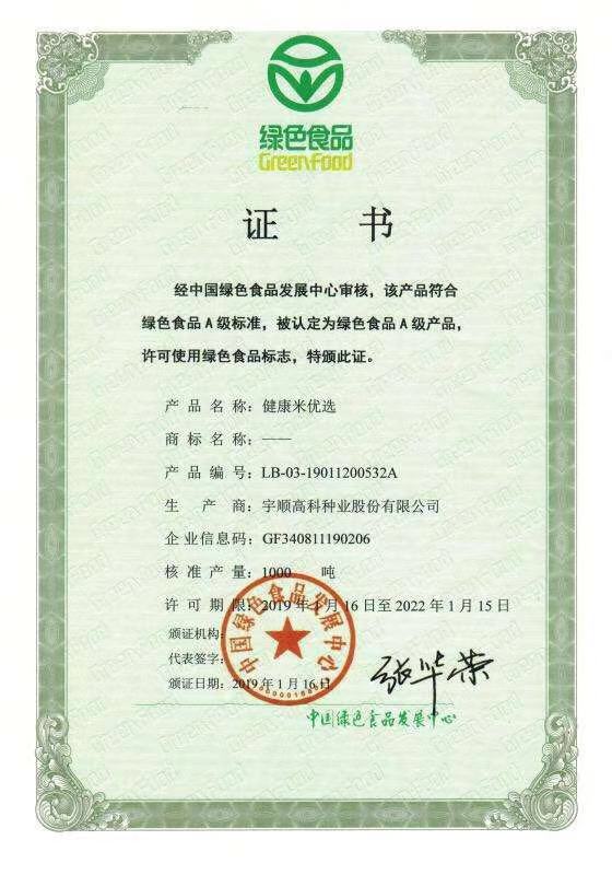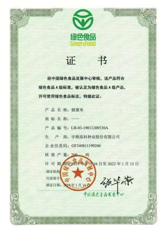 熱烈祝賀我公司健康米、健康米優(yōu)選、健康米尚選、紅米、優(yōu)質紅米五項產(chǎn)品通過中國綠色食品發(fā)展中心審核,獲得綠色食品證書!