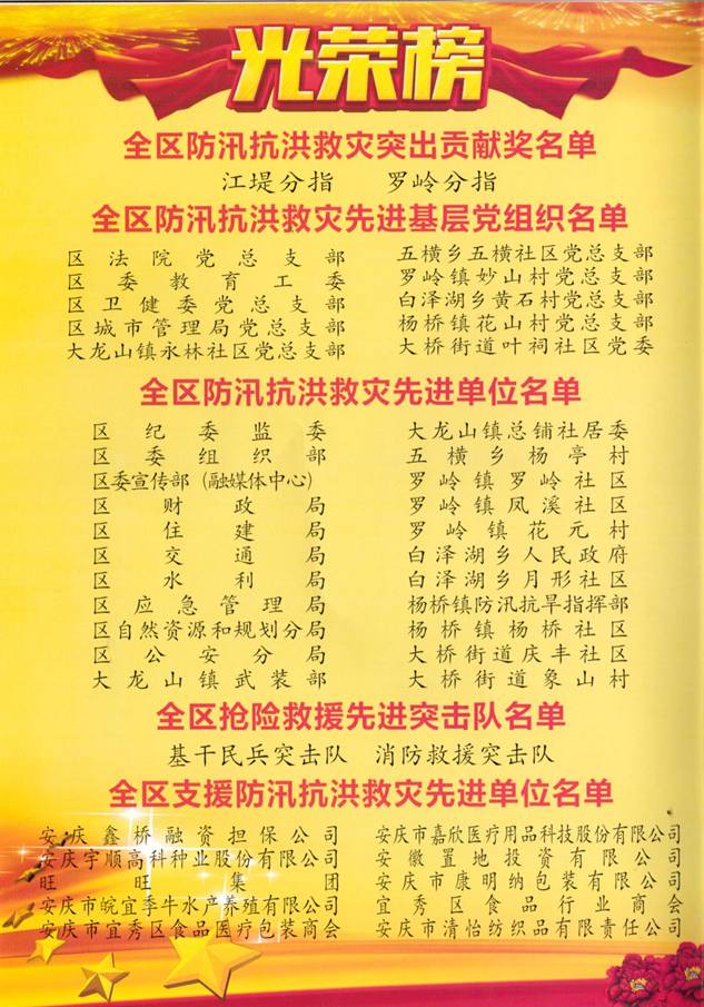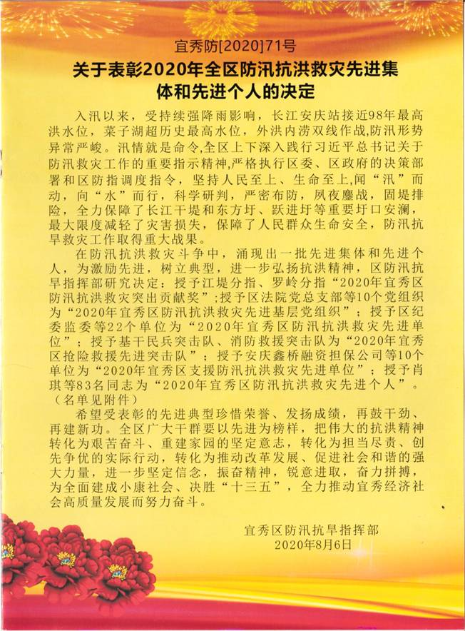 2020年8月8日,在安慶一中(龍山校區(qū))多媒體會議室召開了“2020年全區(qū)防汛抗洪救災(zāi)先進基地和先進個人”表彰大會,區(qū)委、區(qū)政府,各委辦局、各鎮(zhèn)街,受表彰先進集體主要負責(zé)人、受表彰先進個人參加會議。會上,與會人員觀看了防汛抗洪救災(zāi)紀錄片,區(qū)委書記婁雪松宣讀了表彰決定。